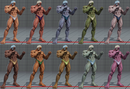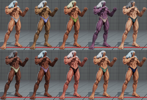 Urien and his amazing technicolor dream thongs! Here’s a glimpse into the muscular madman’s closet, where he’s got a loincloth for every occasion! (Including a tribute to Capcom’s famous blue & yellow logo.) If you still haven’t heard the news, these skimpy costume variations are available for all his outfits in Street Fighter V simply by holding LP+MK+HP after you’ve selected him on the Character Select screen until the match starts.
