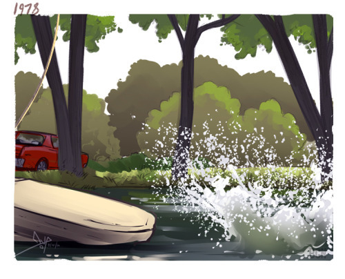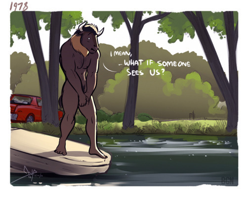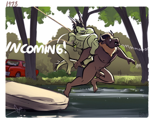 To me, it doesn’t even matter that there’s nudity here. His art is simply fun. There’s this mixture of innocense and masculinity and sex and romance and nature and ridiculous, corny humor to it all. Browsing his gallery is like spending a lazy summer afternoon skinny dipping with your best friend who you’re sorta attracted to but you don’t want to admit it yet, so you just stare and stare, hoping he doesn’t notice your gawking. And yes, it is kinda hot, but there’s so much more going on, there’s your whole lives being lived–even if neither of you realize it right at the moment, because you’re both too busy talking about music, about video games, about teachers, about how nice it is to be away from your parents for the day, about…