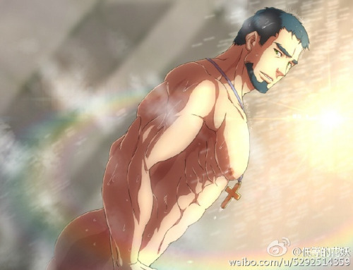 Here’s a preview of some artwork from an upcoming chapter of the bara RPG The End of Dreams, by Studio HANA. The gentleman above is named Kururwach, a man of the cloth (when he’s wearing cloth), and a potential new party member. Just how Kevin & co. will encounter this soaking, saintly stud is still a mystery, so we’ll just have to wait and see what happens!