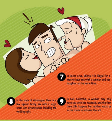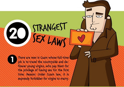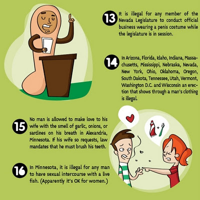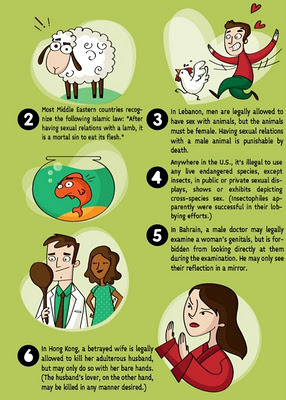 An interesting list I found on Are The Most who shared 20 Strangest Sex Laws and I'll be sharing the rest of the list throughout the week. Click for bigger image - it's worth it to read these laws.