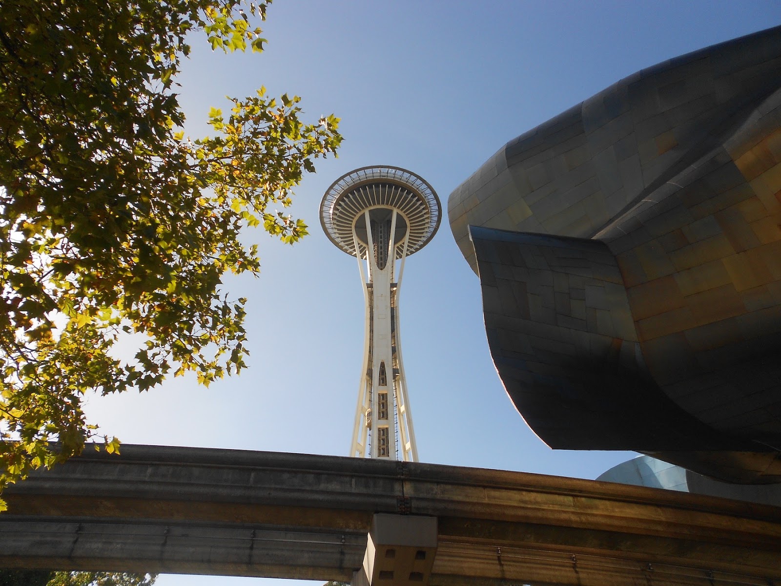 Now some photos from the last few trips. Like the Seattle Space Needle. I took it while en route to the book fair. I take the train from SeaTac to Westlake Square, then take the Monorail from there to the park. The glob of metal on the right of the photo is the Experience Music Project Museum, and the curve of concrete at the bottom is what the monorail rides on.