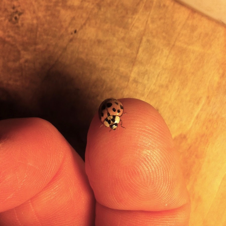 I've had a ladybug wandering all over my desk, the last few days. Just whispering along, staying warm under my lamps. Sometimes resting on a sheet of paper, sometimes on a paper napkin I have folded and to one side, sometimes on my keyboard.
