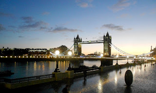 Flying to Manchester for a packing job then down to London for another one. Total of 5 days work but staying 10 days because it's cheaper than flying me back and forth and I wouldn't do that, anyway. I took this photo almost eight years ago, when I hand-carried an original sheet of Handel's music to a client. I couldn't sleep so went wandering and happened onto this shot just as dawn was approaching. You can see Canary Wharf in the distance past the towers.