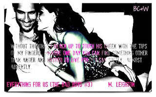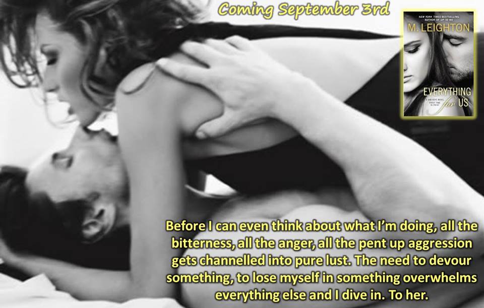 Welcome to the second giveaway and the second excerpt from Everything for Us, book 3 in the Bad Boys series, due out September 3. For today, I have more tasty pics from the fabulous minxes for you to choose from. It only runs today and tomorrow, so hurry! Same rules apply. Pick your poison, share it on Twitter and/or Facebook with the caption over there in the Rafflecopter link. Those both count for 2 entries. You can also gain an entry by following me on FB and/or Twitter if you don't already. Up for grabs? Another signed ARC of Everything for Us and a #NashtyGirl t-shirt. Wahooooooooooooo