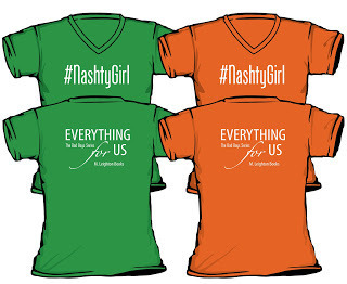 But I digress. Entering is easy peasy. Up for grabs is a brand new, shiny and lovely ARC of Everything for Us, as well as a #NashtyGirl t-shirt in either apple or mandarin (pictured at the bottom), and a Cash shot glass. I'll draw a winner on Thursday morning (9-22) then post different pictures and start this all over again. I'll rinse and repeat on Monday, Wednesday and Friday of next week and then a different, bigger, better, stronger, faster, bionic-ER giveaway will start on Sunday, September 1st. If you don't remember all this, don't worry. I'll be doing a post about it on all of those days:) YAY!