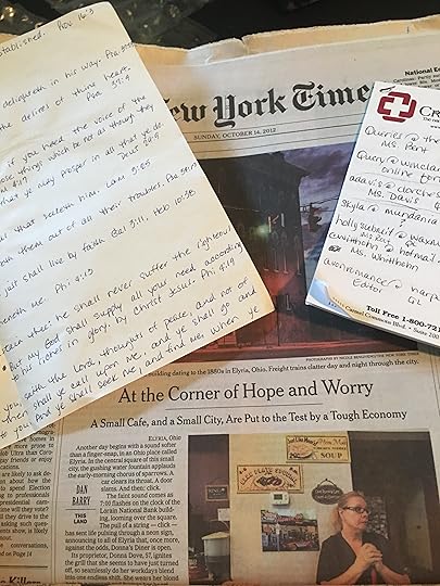 Something I’ve done for years to address my concerns, however, was to write out scripture that pertained to what I was worried about and include some that would encourage me. I made this list (front and back) and would pour over these each day, sometimes more than once, reminding myself why I was making the change and remembering who I was trusting to make it happen. That’s what you see to the left of the captioned picture. What you see to the right is a thick stack of notes containing the names of all sorts of agents I queried in those early days. What I want to tell you about today, however, is what both of those rest upon. The New York Times for October 14, 2012.