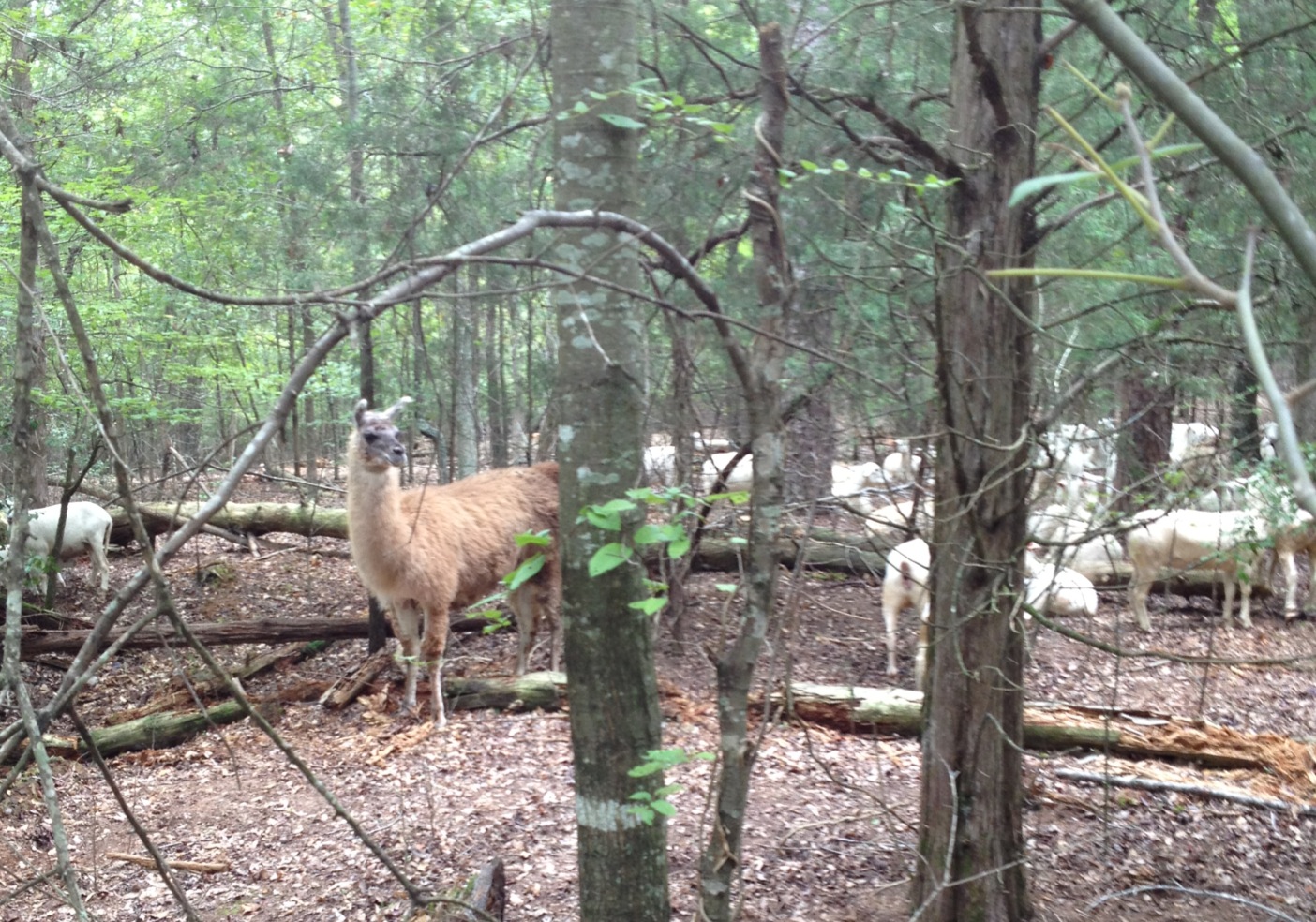 This is Pedro the llama. Some sheep might come into the woods by themselves to have their young