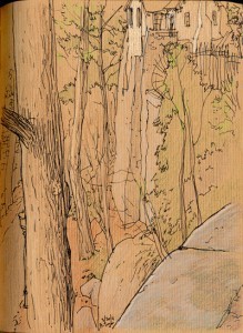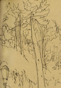 Then I went home and scanned a bunch of stuff from this sketchbook — which, as it happens, I started right after moving to NY, and which contains a few nice sketches I don't think I've shared yet. First, there's The Cloisters: