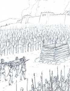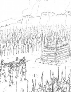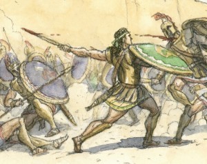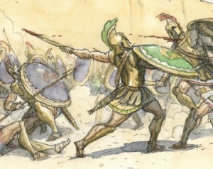 I enlarged and printed out the darkened-and-corrected pencil drawings on a piece of 140lb. cold-press watercolor paper, using my Epson Stylus 2200 printer, which prints up to 13×19″ and uses ink that is waterproof under most conditions. Actually, it kind of repels water, so I often have to go over each stroke twice to get the paint to cover the linework. I painted the art with watercolors, scanned it back in, and made any last-minute corrections — for example, I decided later to remove Achilles' helmet, since he was bare-headed in the previous battle scenes.