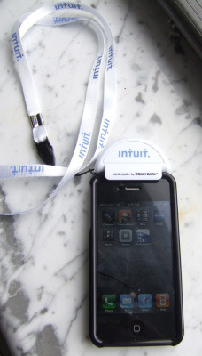 This week I received the card-swiper hardware for both apps. Square's hardware is a tiny white square. Intuit's is a sort of half-circle. They both plug into the headphone jack. They both feel a little flimsy, partly because they're small and light, partly because the jack allows them to rotate. Intuit's has a little bar that catches on the phone and keeps it from rotating in one direction, but it still freely rotates in the other, so this doesn't make much difference. Intuit also includes a potentially handy plastic case and a lanyard, so it might be harder to lose. Both readers worked well in initial tests. I did about half a dozen swipes using 3 different cards, and square only made me re-swipe once, while Intuit made me re-swipe twice on one card and once on another. I will let you know how they hold up after I stress-test them at NCTE next month.