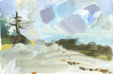 Friday was a very foggy morning on the beach. Henry gave a great little demo and talk about seeing everything as solid, even the air, and treating it that way, rather than having a background with a subject in front of it. My first attempt at this was clumsy. I was using gouache, which is my favorite medium for landscape. It’s hard to cover a large surface with gouache though, and that caused some problems every time I tried to work larger than about 5×7″.