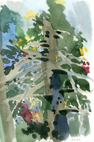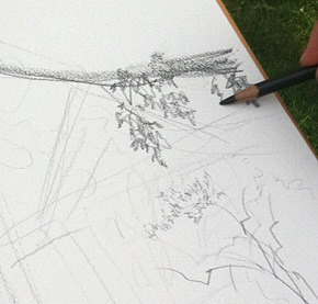 Then I start to add some values and details. Because life sketching usually needs to be done quickly (whether because of changing light, need to eat, other time constraints, or just to stay loose), I try to find some quick, scribbly marks that represent the different types of leaves for each tree.