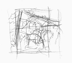 I often start out with a quick “thumbnail” composition, to figure out the framing and the main elements I’m interested in. In this case you can see I’m emphasizing the curve of the small tree, the trunk of the pine on the left, and the large branch of the oak coming in from the right, and you can see how I tried both horizontal and vertical framing.