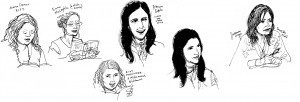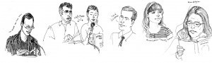 Last week I went to David Levithan’s YA author reading series at the Jefferson Market NYPL*, and quite enjoyed it. There were nine authors reading samples of their newest books, including my friend Tim Decker. I doodled some (probably bad) likenesses of the authors as they read.
