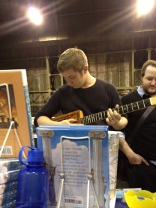 a fan trying out one of Tim's dad's way-cool cigar box guitars.
