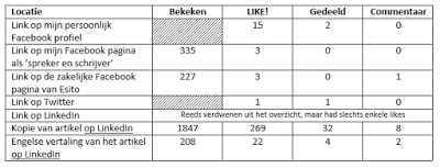 Hetzelfde artikel publiceer ik direct daarna ook op mijnblog, links naar dat artikel post ik op de sociale drievuldigheid van Facebook, Twitter en LinkedIn. Daar stel ik dan af en toe wel eens gekke dingen vast. Het lezerspubliek reageert heel erg verschillend op al deze media. Ik merk dat ik voor echt zakelijke blogartikels veel meer reacties krijg op LinkedIn dan op Facebook. Artikels en links die ik publiceer over andere onderwerpen krijgen dan weer meer bijval op Facebook.