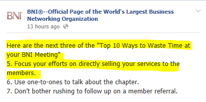 Zoals ik al aangaf gebeuren verkopen aan de andere leden van je businessclub uiteindelijk vanzelf, omdat je nu eenmaal liever zaken doet met mensen die je goed kent dan met vreemden. Maar door hierop te focussen geef je een verkeerd signaal naar andere leden... en in het bijzonder naar nieuwe leden.