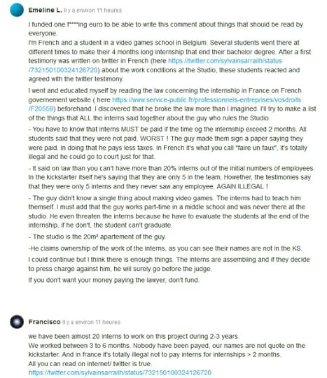 So if you read this, for the sake of protecting the rights of young artists, interns and other young job-seekers, please try to get the word out about these abject practices. And if you supported this project, I Humbly urge you to consider canceling your pledge.Don’t hesitate to contact me in a private message if you want more information on the matter, and I’ll try my best to answer your questions or at least direct you towards people who are more directly concerned by the whole affair.