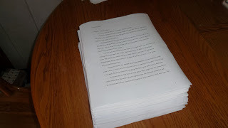 After completing its major edit I now move onto a paper and pen proofreading. It's important to include a good old fashioned eyes on paper proofreading when I prepare a manuscript for publication. Everyone knows that mistakes are easier to miss on screen than on paper, so I always do this step. My condolences to the trees that died to provide this 621-page chunk of fiber. There are so many pages because it's printed double spaced in 12 point font. This gives lots of room around each word and aids in the detection of problems. The extra space also makes it easy to add correction symbols and notes.