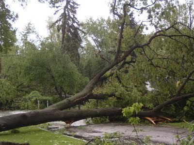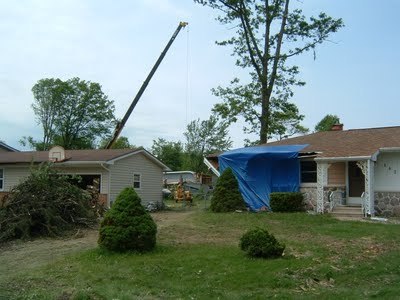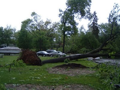 Curious, I packed the boys in the Jeep and went exploring. This was when I realized that the storm damage went far beyond my little neck of the woods. Trees large, medium, and small were down in tangled heaps everywhere. Some had crashed into houses. Power lines were drooping all over the place or on the ground and tangled in trees. When I finally reached the main commercial road after driving on power lines and navigating around fallen trees, Columbia Avenue was strewn with the chunks of the roofs of many commercial buildings. Signs were broken, bent, and twisted. I saw some parking lot lamps completely bent over. The tops of power poles were sheared off and still hanging from their wires. I read later in the Battle Creek Enquirer that approximately 100 utility poles went down in the storm. I still don't know how many homes have been damaged, and I doubt that any one will ever know how many trees went down.