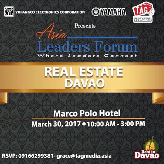 On March 30, 2017 from 10AM to 3PM, another Asia Leaders Forum in Real Estate will be launched in Davao this time with the collaboration between Yupangco Electronics Corporation (Distributor of Yamaha Sound and Audio Technology) headed by Jose Mari L. Yupangco and TAG Media and Public Relations headed by Engr. Grace Bondad Nicolas.