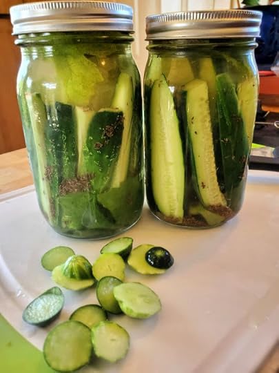This year, I've had cucumbers dribbling in from the garden a few at a time. We don't eat very many raw cucumbers in salads and such, and so far the harvest isn't big enough to bother canning them, so I've been making refrigerator pickles.