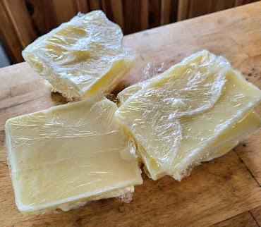 As homesteaders, you may collect the fat from your own cattle at butchering time. Or, if you purchase a steer for your freezer, you may request that the butcher set aside fat for you. Otherwise, you can buy unrendered fat at any good butcher's shop. You can also save the fat from any cuts of meat you buy. (I've read that the fat from beef brisket is pretty close in flavor to suet, once rendered; later in the year, I'll give it a try and let you know what I think.)