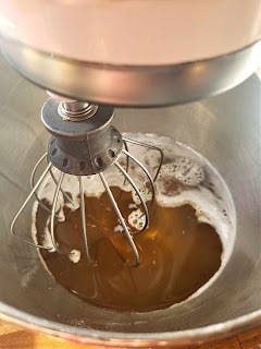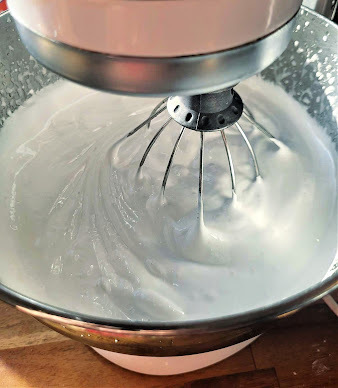 7. Now increase the speed of the mixer to HIGH and beat until the mixture is soft, doubled in volume, and resembles soft whipping cream, about 10-15 minutes. (If you've ever bought "marshmallow fluff" in a jar, that's what you have right now!)
