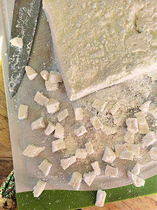 10. Use a knife to cut out marshmallow squares of the desired size. Or, if you prefer, use a cookie cutter to make shaped marshmallows. (You may need to lightly oil cookie cutters.) After cutting, toss the marshmallows in powdered sugar or arrowroot powder so that all sides are coated. (This helps keep the marshmallows from sticking to each other.)