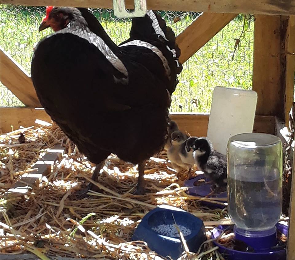 In addition, we had one hen successfully raise chicks to pullets (basically, teenage chickens) and another hen has decided she wants babies, too. Currently, she's sitting on a clutch of eggs in a cage that's separate from the other chickens.