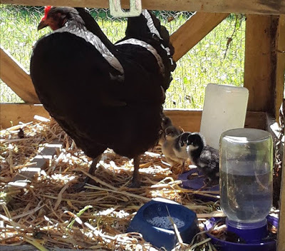 * We have babies! Chicks, that is. While I was busy with surgery and recovery, my husband moved our broody hen and her eggs to a separate cage and let her incubate to her heart's content. All five eggs hatched and we now have cute little fluff balls. We've moved Mama and her babies to a slightly larger cage and placed that inside the chicken run. This allows the rest of the flock to become accustomed to the chicks without danger they will hurt the babies. We will wait until the chicks are considerably bigger before releasing them into the larger chicken run and hen house.