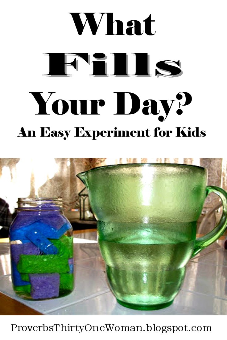 Then I touched the pitcher of water. "Jesus is like this water," I said, as I slowly poured the liquid into the jar. She wasn't sure she understood, so I explained: "It seemed there was room for nothing else in the jar, didn't it? But there was plenty of room left for this water. Sometimes our lives seem so busy - much too full for us to spend time with God. But there is always time for Him. And what do you notice about the sponges now?"