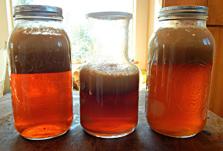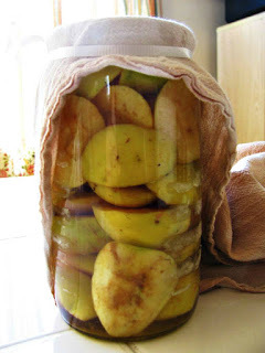 2. Wash some glass jars and fill them about half full with coarsely chopped fruit scraps (peels, cores, bits of fruit - but not rotten or bruised parts). Pour the sugar water over them, leaving about 1/4 inch headspace. Cover with cheesecloth held in place with a rubber band and allow to sit at room temperature. Stir once a day with a freshly washed spoon.