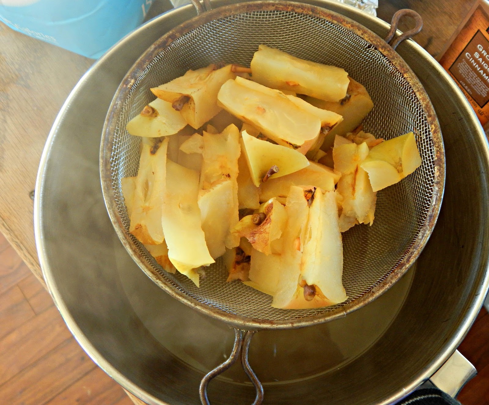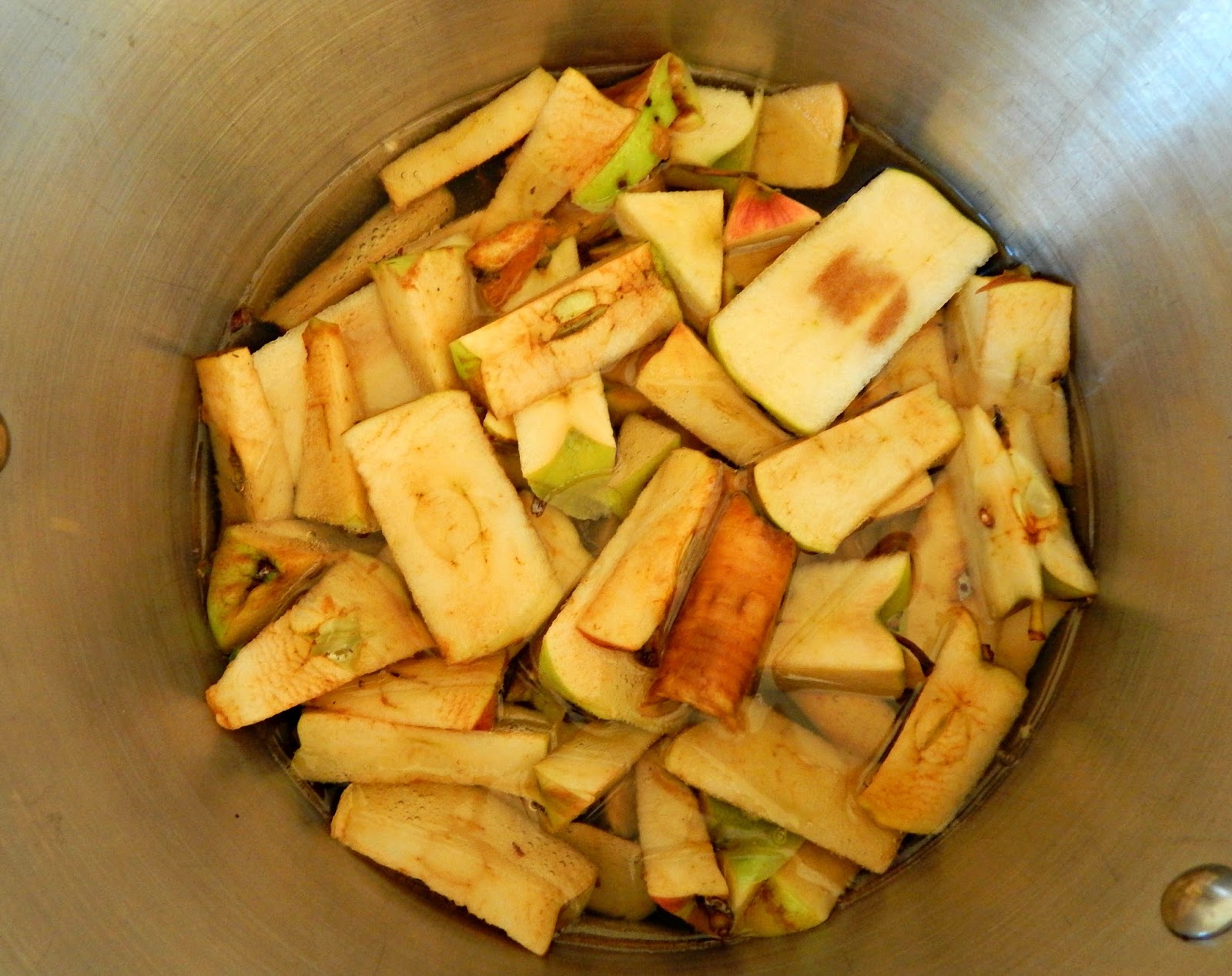 1. Place a bunch of apple peels and cores in a large pot. Cover, just barely, with water. Bring to a boil.