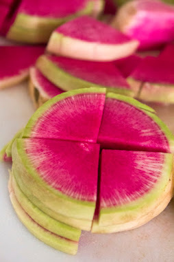 Watermelon Radish: With light green and white skin, but pink inner flesh, watermelon radishes are sweeter than table radishes, but they do still have a bit of "bite" to them. This radish is from the daikon family, but deserves special attention because of its unique look and flavor.
