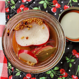 If you prefer the healthy probiotics of fermented pickles, you can make radish pickles this way, instead: Stir 2 teaspoons of sea salt into 2 cups of non-chlorinated water until fully dissolved. Most radishes should be halved or quartered, but longer radishes, like daikons, can be sliced into fry-like shapes. Or you may slice the radishes into rounds. Place the prepared radishes in a freshly washed jar, then cover with the brine. If you like, you can add flavorings such as a clove of garlic and a sprig of dill, to the brine. Weigh down the food so it sits below the liquid level (a freshly washed jelly jar filled with marbles will work, or use a store-bought weight), then cover the jar with cheesecloth held in place with twine or a rubber band. Place the jar inside a bowl in case liquid overflows during fermentation, then place everything in a cool location. After the first day, begin tasting the radishes (always with a freshly washed fork) to see if you're satisfied with their level of fermentation. I don't recommend fermenting beyond 5 days. The radishes will become softer every day you ferment.