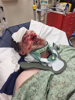 When I found the accident on our road, I really expected to see my husband dead or nearly so. Instead, I saw him sitting up, leaning against the his fallen scooter, holding a towel to his head. There was blood everywhere. One whole side of his face was all injury and one eye was swollen completely shut. He was speaking with a man from the fire department, who got there before the ambulance or Sheriff's deputy. I said a prayer of thanks and approached him. The first thing my husband said was, "I'm so sorry. I am okay. I'm okay."
