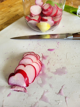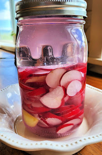 Many people are unsure how to eat radishes and don't know that if you cook them, all or most of their "bite" disappears. For some of my favorite ways to eat radishes, see this post. But usually, the first thing I make with radishes is fermented pickles. These are super easy to make and are packed with pro-biotics. And the radishes become very mild tasting. They make an excellent condiment or snack.