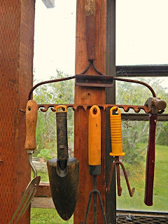 * The previous owners of our homestead left behind all kinds of junk. Piles, and piles, and PILES of it. We are using what we can, sorting out scrap metal, and will spend thousands hauling the rest to the landfill. One of the things they seem to have collected were broken tools, including rakes with broken or missing handles. Last week, I had hubby turn some of them into the BEST garden tool organizers. They are totally practical but also look like they've been there a 100 years. (Hubby wants me to tell you that normally he'd have everything lined up perfectly like the type A he is, but he knew I wanted the old, imperfect look...so he gave it to m.)