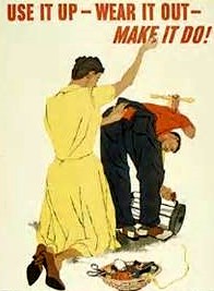 1. "Use it, Wear it out, Make do" was the motto of the Depression and WWII. Patch clothes, make do with household items that aren't perfect but still get the job done, and never replace an item you can fix.