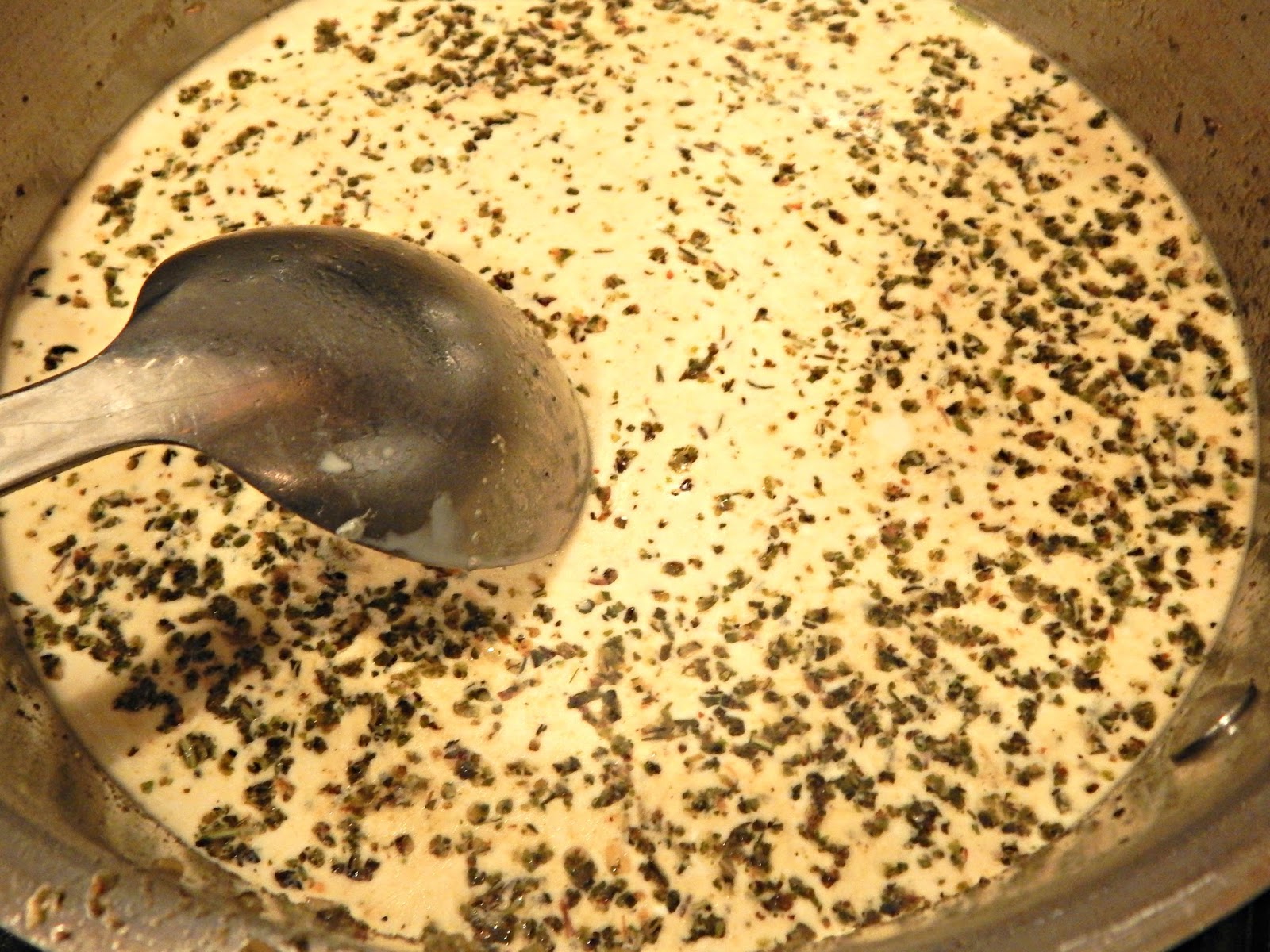 3. Add the almond flour, stirring until you cannot see it any more. A little at a time, stir in stock and cream. Stir constantly until thickened a little.