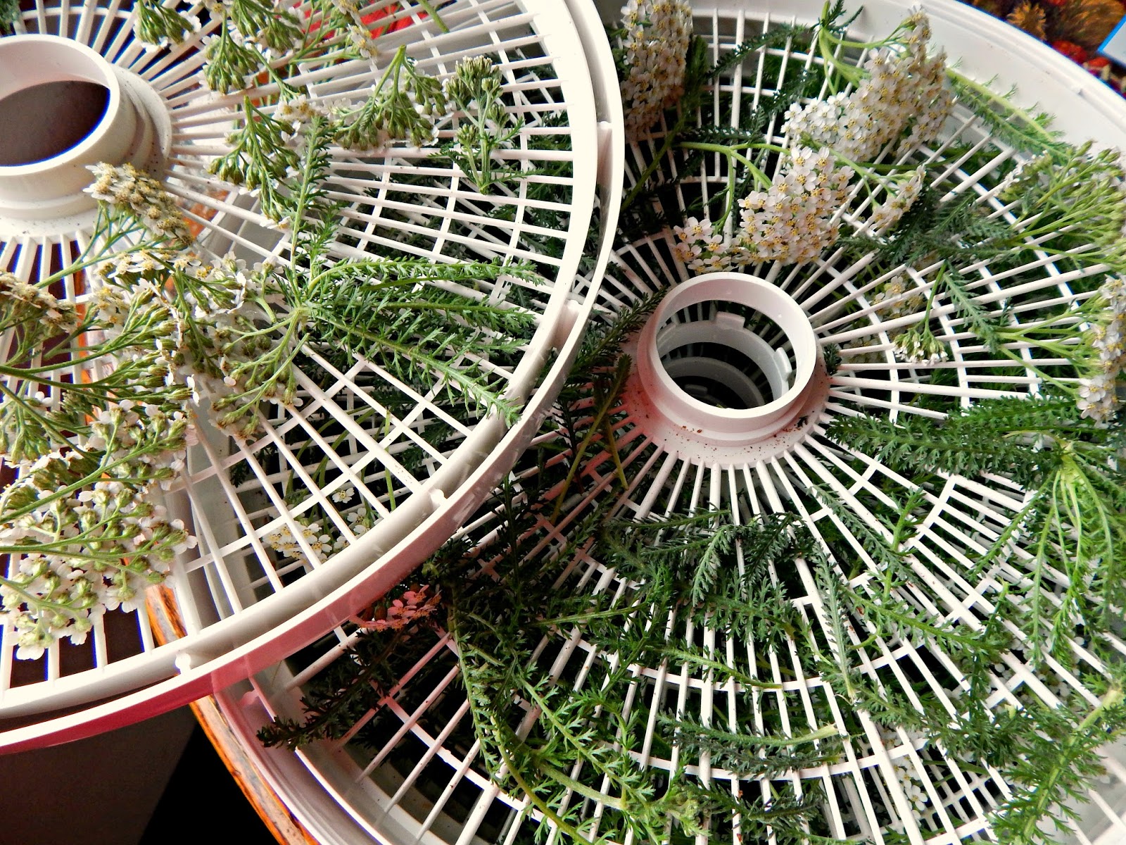 To facilitate using yarrow all year long, the roots, leaves, and flowers are typically dried before use. People have been air drying medicinal herbs for thousands of years, and you certainly can preserve them that way today; but if you have a food dehydrator, I recommend using it (at about 95 degrees F.). It will dry the herb more quickly and retain more of the medicinal qualities of the plant. Store in a glass jar with an air tight lid in a cool, dark, dry location. The dried herb will last several years; as long as it is still aromatic, it has some medicinal qualities left in it.