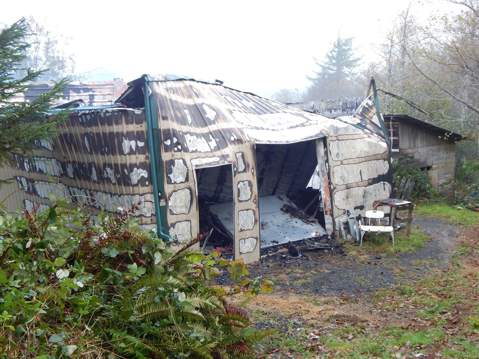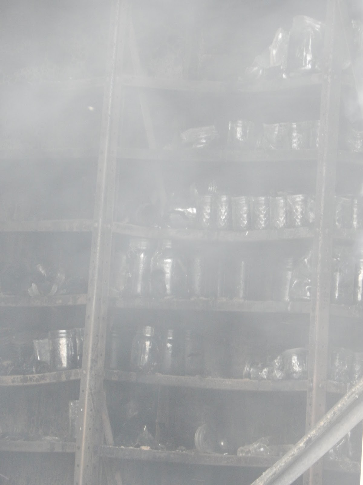 In the wee hours of the morning, it was disturbing to watch the building burn. Seeing the wreckage by daylight is almost worse. I can see the metal shelves that still hold my canning jars, which are warped and melted. Oh, it's painful to see all that healthy food I was so pleased to have for my family (after hours and hours of work) gone!