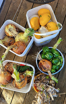 * Roots. Instead of pulling out the roots of plants when they are spent, leave them in tact. As they decay, all the good nutrients they pulled from the soil will go back into the earth. (If the roots are in the way of new plants you want to add to the garden, dig them out...then throw them in the compost pile.)