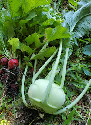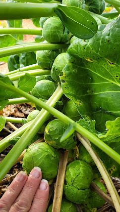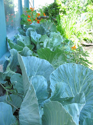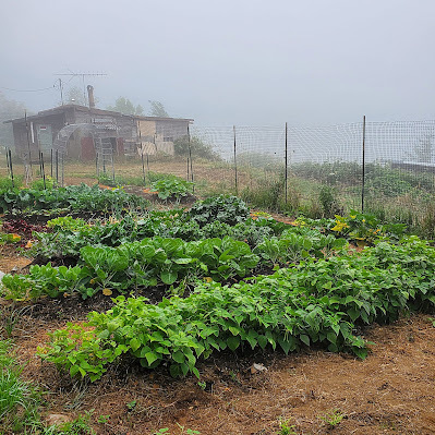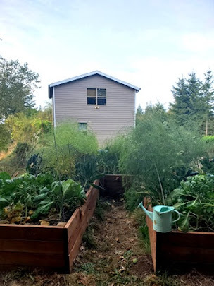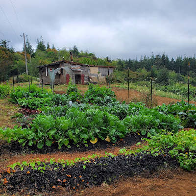 The garden is now ready for winter: All the tender crops are harvested, and I left most of the summer plants in the soil. This helps prevent erosion during winter, and as the plants die, all the nutrients built up in the roots release into the soil. I've also covered the top of the soil with rabbit manure. (Don't have manure? Add whatever organic matter you have on hand, like dried leaves, dried grass clippings, leaves from healthy plants, roots from previous crops, compost,wood chips...laid on top of the soil, not dug or tilled in, if you're following the abundant and easy no till, no dig method I use.)