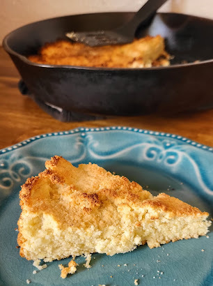 4. Pour the batter into the pre-heated skillet, using a fork or the back of a spoon to even it out. Bake 20 to 25 minutes, or until the edges are golden brown. Remove from the oven and place on a cooling rack. Wait until the "corn"bread is cool before slicing.