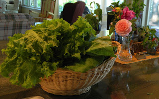 Mounds of tender lettucesprinkles of fragrant rosespeoniesmint