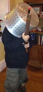 This first one (above) is of my six-year-old grandson being a soldier. That's a crab pot strainer helmet. Of course.When my own son was young, I didn't buy him toy guns,but he fashioned guns out of sticks and helmets out of potsnonetheless.