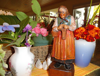 My husband gave me this wooden figure (I call her 'Knitting Grandma') for my birthday this year. She stands about seven inches high and I love the detail: her expressive face, her wire glasses and metal knitting needles, the folds and pattern on the apron, the tiny flower dots on her headscarf, the hunch of her shoulders, the flat black slipper shoes. She has taken on a life of her own in our kitchen, watching benevolently over her territory.