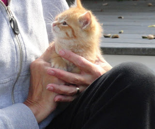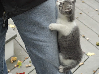 P. S. Update: The mother cat came to the rescue, at least temporarily. She lured the kittens back under the deck by dangling a chipmunkfrom her mouth.A cute little baby chipmunk.